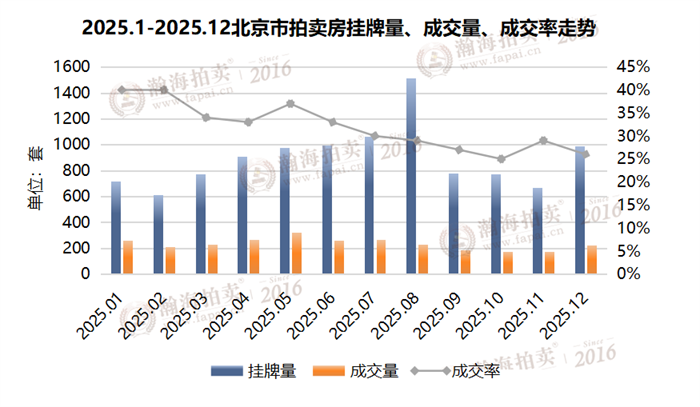 回顾2025年全年的北京市拍卖房挂牌量、成交量、成交率走势图可以看到,全年的成交率最高月份集中在1、2月份。去年12月份,北京放宽非京籍及多孩家庭购房限制,并不再区分首套、二套商贷利率,并将二套公积金贷款首付比例降至25%。