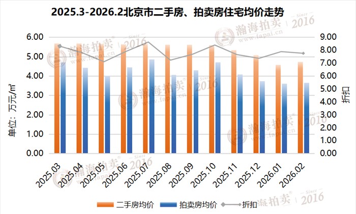 2月,拍卖房住宅平均成交单价3.66万/㎡,二手房住宅平均成交单价4.72万/㎡,拍卖房住宅成交折扣为7.75折成交。