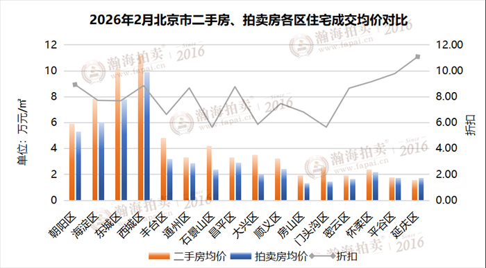 2月,北京市拍卖成交住宅中,延庆区的拍卖房高于二手房单价,比较特殊;平谷、怀柔两个区的拍卖房与二手房单价接近,都在9折以上;朝阳、西城、密云、昌平、通州5个区域在8.6-9折之间;其余区域在5-8折之间。