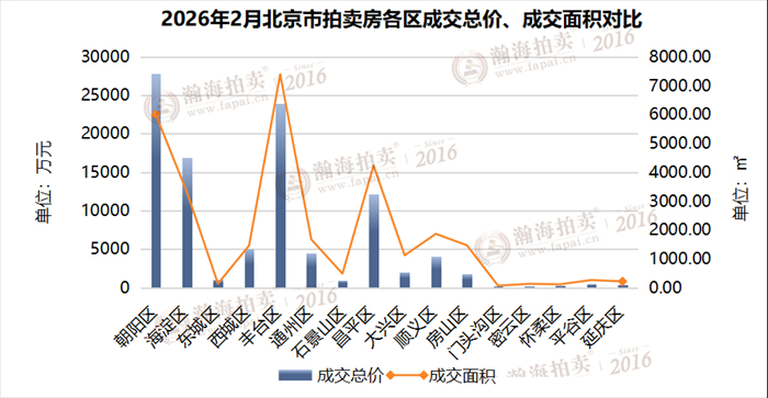 2月,朝阳区以成交总价27817.98万元,成为成交价第一名;丰台区以成交面积7387.54平方米,成为面积第一名。
