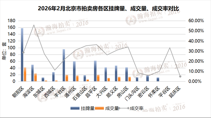 2月,海淀区有效上拍43套,成交24套,成交率55.81%,排名第一;昌平区有效上拍55套,成交20套,成交率36.36%,排名第二;石景山、房山、平谷、顺义、通州5个区,成交率都在30%以上。
