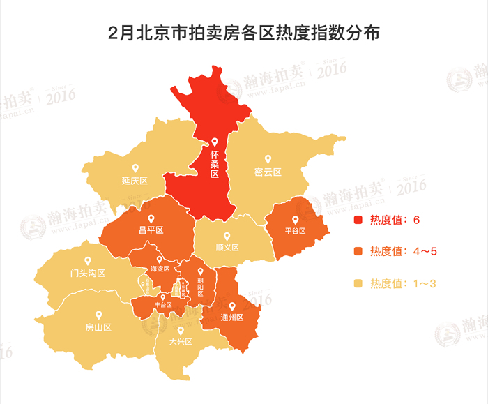 2月,北京市拍卖房各区热度中,怀柔区1套成交6人报名,占据热度第一;朝阳、丰台、昌平、东城、平谷5个区域的套均报名人数在5-6人之间,海淀区、通州区平均报名人数在4.5人以上。门头沟、延庆等远郊区,竞争相对较小。