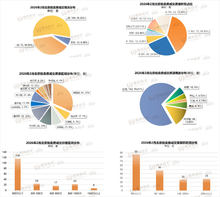 2月,北京拍卖市场共计成交拍卖房188套,其中二拍成交104套,占比55.32%,超过一半。折扣方面,7-8折成交房源72套,占比38.30%;8-9折成交49套。从区域分布来看,朝阳区占32%,成交81套。从房源用途分析,普通住宅占据70.21%;成交房源中,总价300万以下的刚需房源成交量116套;面积90㎡以下的房源有86套。