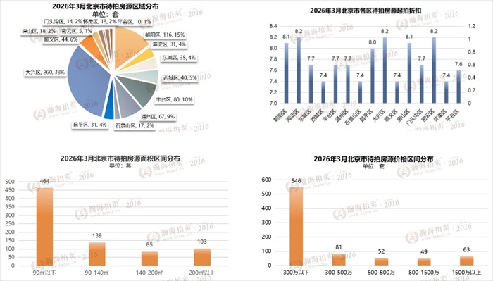 截至目前,3月份有效待拍791套,环比上涨14.47%,同比上涨16.32%,挂牌总价83.79亿元,挂牌房源总市值119.22亿元,平均起拍折扣7.1折;待拍房源中,一拍房源599套,二拍153套,三拍/变卖39套。