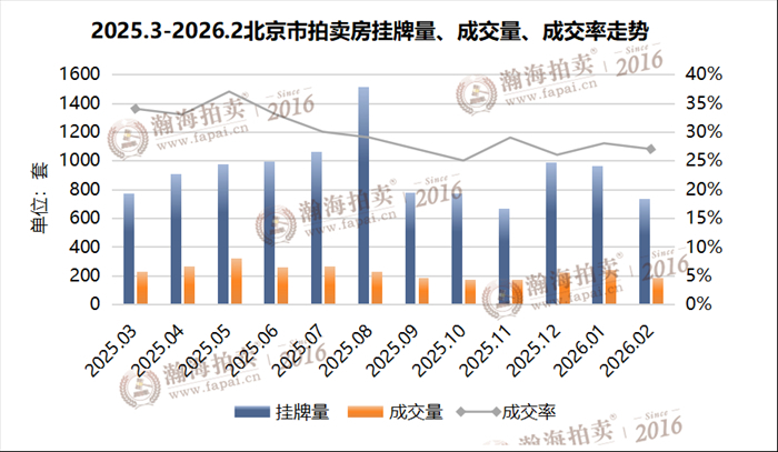 2月,北京拍卖房挂牌房源738套,缓拍47套,有效开拍691套。成交房源188套,成交率27%(此数据已减去撤拍套数)。