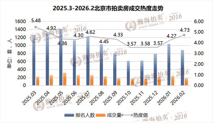 2月,北京市拍卖房总参拍人数889人,环比下降14.68%,同比下降30.82%,套均参拍人数4.7人,与上月相比上涨0.4个百分点,较过去6个月套均参拍人数3.9人相比,高于平均水平0.8人。